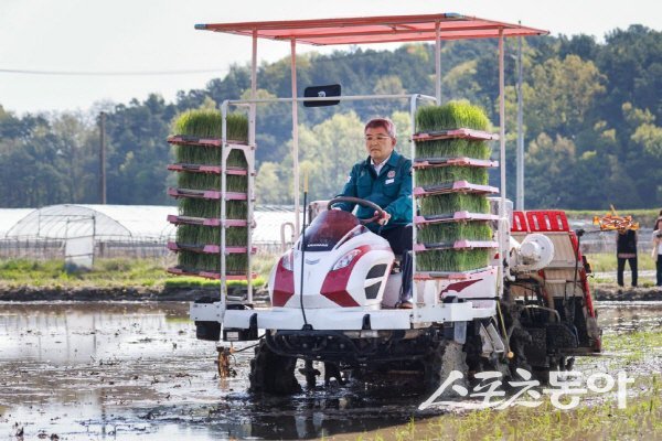 김학동 예천군수가 26일 개포면 경진리에서 올해 첫 모내기 시연을 하고 있다. 사진제공 ㅣ 예천군