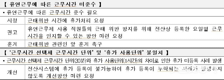 특히, ‘근무시간 선택제 근무 시간 단위(30분)’와 ‘휴가 사용 단위(1시간)’ 간의 단위 불일치로 인해 휴가 등록이 누락되는 사례가 발생한 점이 지적됐다. 이에 대한 전산 시스템 개선 요청이 개선 사항으로 제시됐다. 아울러, 근태 규정을 위반한 관련자에 대해서는 훈계 조치가 함께 이뤄졌다.