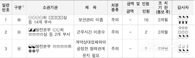 감사 결과, 총 13개 분야에서 다양한 문제점이 지적됐다. 특히, 보안 관리 미흡으로 16명, 근무 시간 미준수로 2명, 계약 상대 업체와의 부적절한 언행으로 1명이 각각 신분상 ‘주의’ 조치를 받았다.