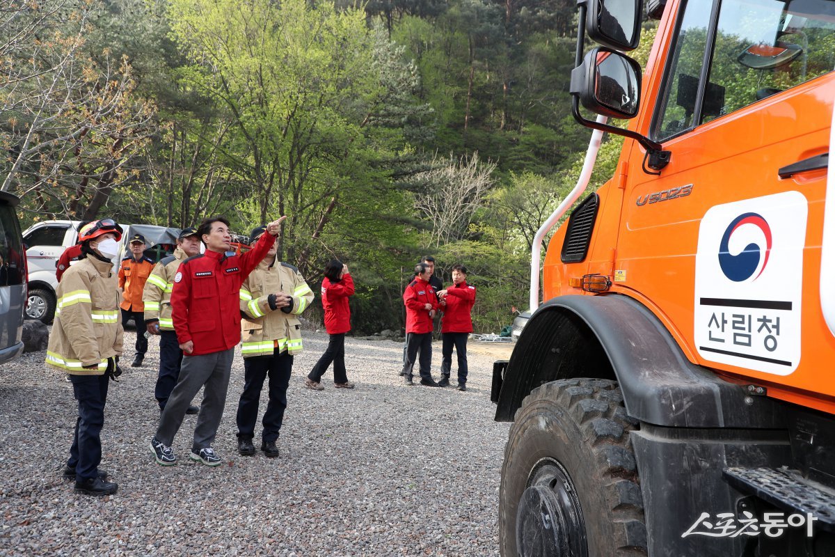 김진태 강원특별자치도지사가 4월 27일 오전 8시, 인제군 상남면 산불 최초 발화지점인 매화골을 찾아 현장을 살펴보고 있다. 사진제공|강원도