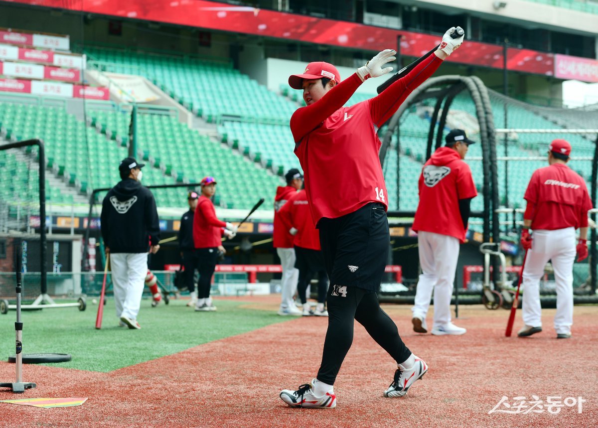 27일 인천 SSG 랜더스필드에서 ‘2025 신한 SOL 뱅크 KBO리그’ SSG 랜더스와 키움 히어로즈의 경기가 열린다. 경기 전 SSG 최정이 타격 훈련을 하고 있다. 인천 | 김민성 기자 marineboy@donga.com