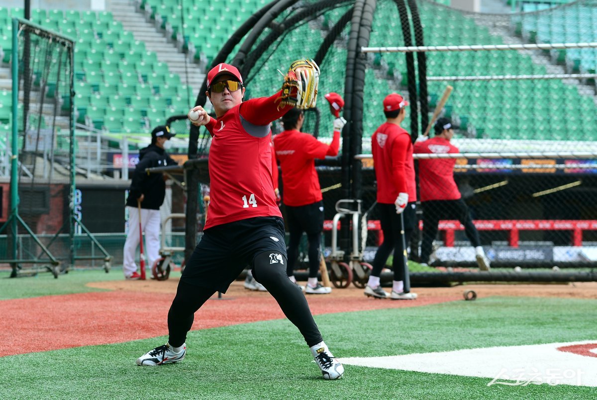 27일 인천 SSG 랜더스필드에서 ‘2025 신한 SOL 뱅크 KBO리그’ SSG 랜더스와 키움 히어로즈의 경기가 열린다. 경기 전 부상에서 회복한 SSG 최정이 훈련을 하고 있다. 인천 | 김민성 기자 marineboy@donga.com