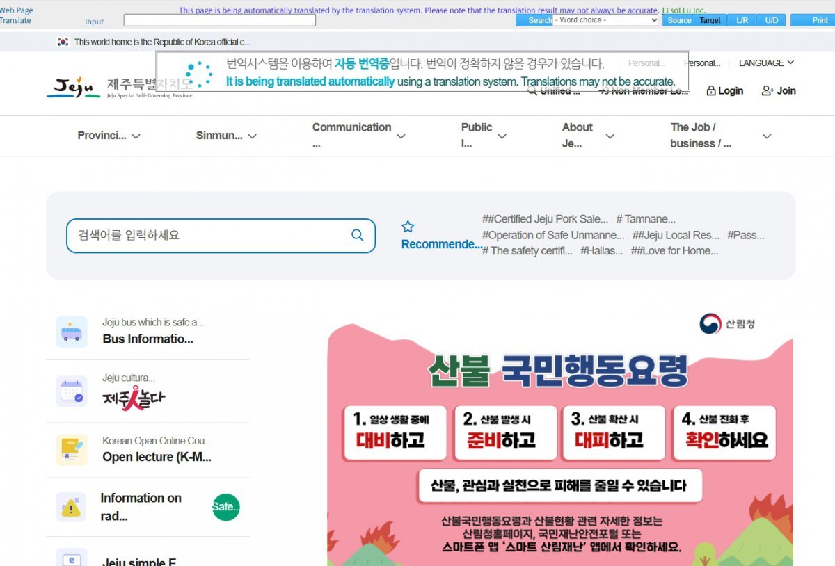 특히, 최근 넷플릭스 시리즈 ‘폭싹 속았수다’의 배경지로 주목받은 제주특별자치도는 외국인 관광객의 방문이 많은 지역임에도 불구하고, 공식 영문 사이트가 자동 번역에만 의존하면서 페이지 로딩이 느리고 문맥에 맞지 않는 번역 오류가 빈번하게 발생하는 것으로 나타났다. 이로 인해 정보 탐색 과정에서 지연 현상이 발생하고, 중요한 관광 정보가 왜곡되거나 전달되지 않는 문제가 지속해서 제기됐다.