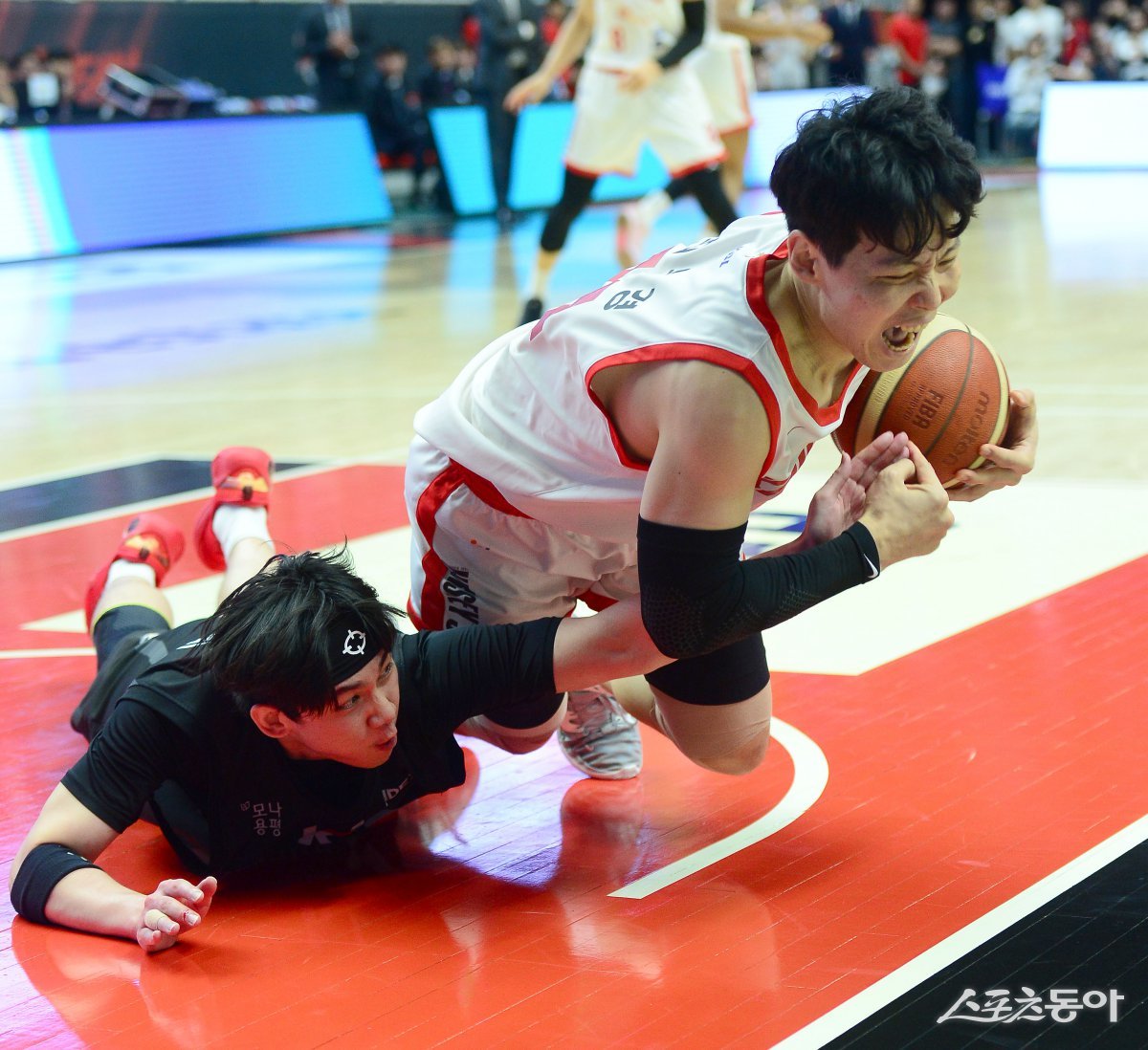 27일 수원 KT 아레나에서 열린 ‘2024-2025 프로농구’ 4강 플레이오프 3차전 KT와 SK 경기에서 KT 박준영과 SK 최부경이 루즈볼을 다투고 있다. 수원|김종원 기자 won@donga.com