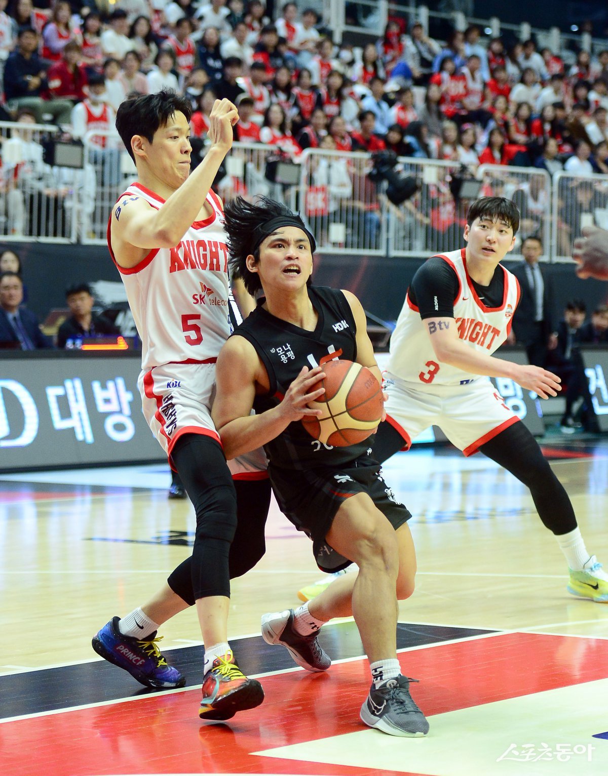 27일 수원 KT 아레나에서 열린 ‘2024-2025 프로농구’ 4강 플레이오프 3차전 KT와 SK 경기에서 KT 카굴랑안이 SK의 수비를 뚫고 골밑을 공격하고 있다. 수원|김종원 기자 won@donga.com