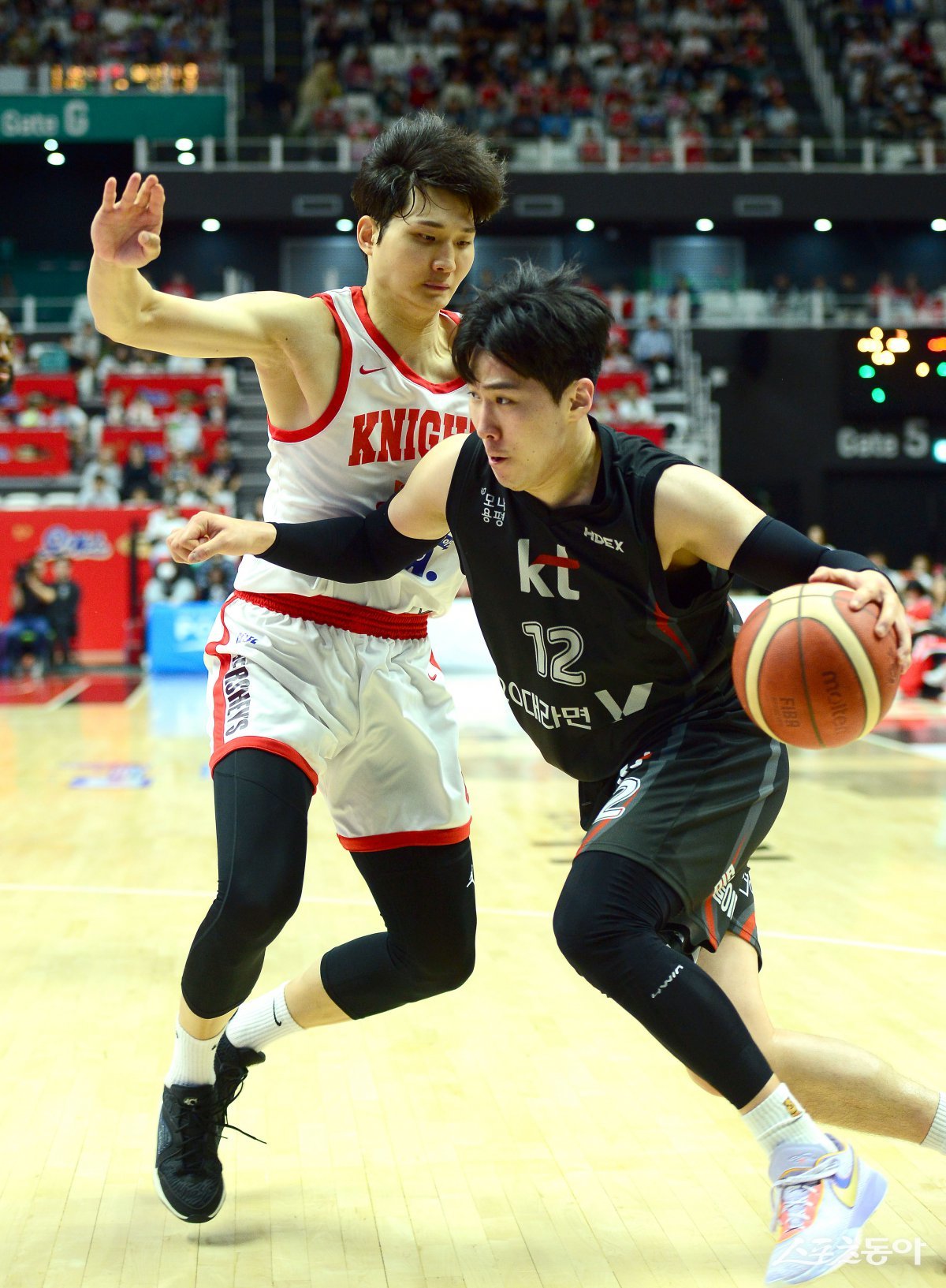 27일 수원 KT 아레나에서 열린 ‘2024-2025 프로농구’ 4강 플레이오프 3차전 KT와 SK 경기에서 KT 문정현이 SK의 수비를 뚫고 골밑을 공격하고 있다. 수원|김종원 기자 won@donga.com