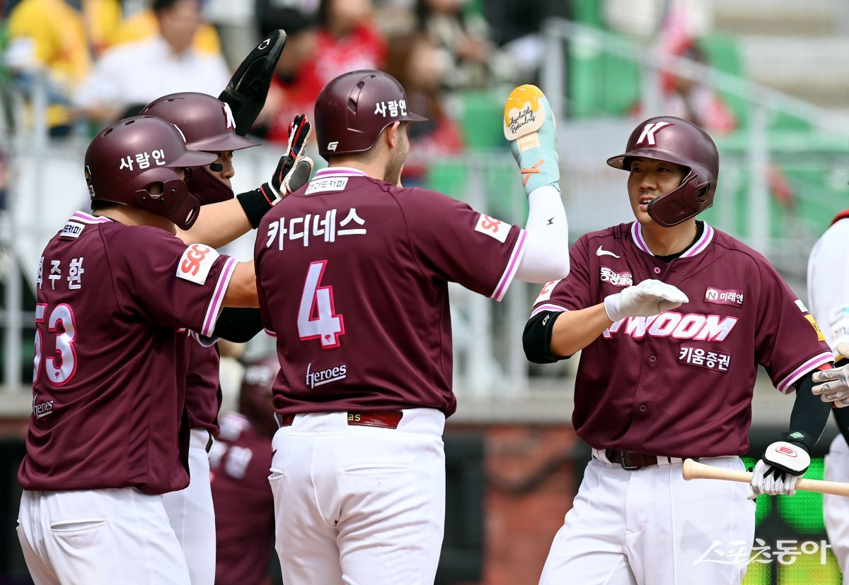 27일 인천 SSG 랜더스필드에서 ‘2025 신한 SOL 뱅크 KBO리그’ SSG 랜더스와 키움 히어로즈의 경기가 열렸다. 3회초 2사 만루에서 키움 오선진이 그랜드슬램을 쏘아 올린 후 동료들의 환영을 받고 있다. 인천 | 김민성 기자 marineboy@donga.com