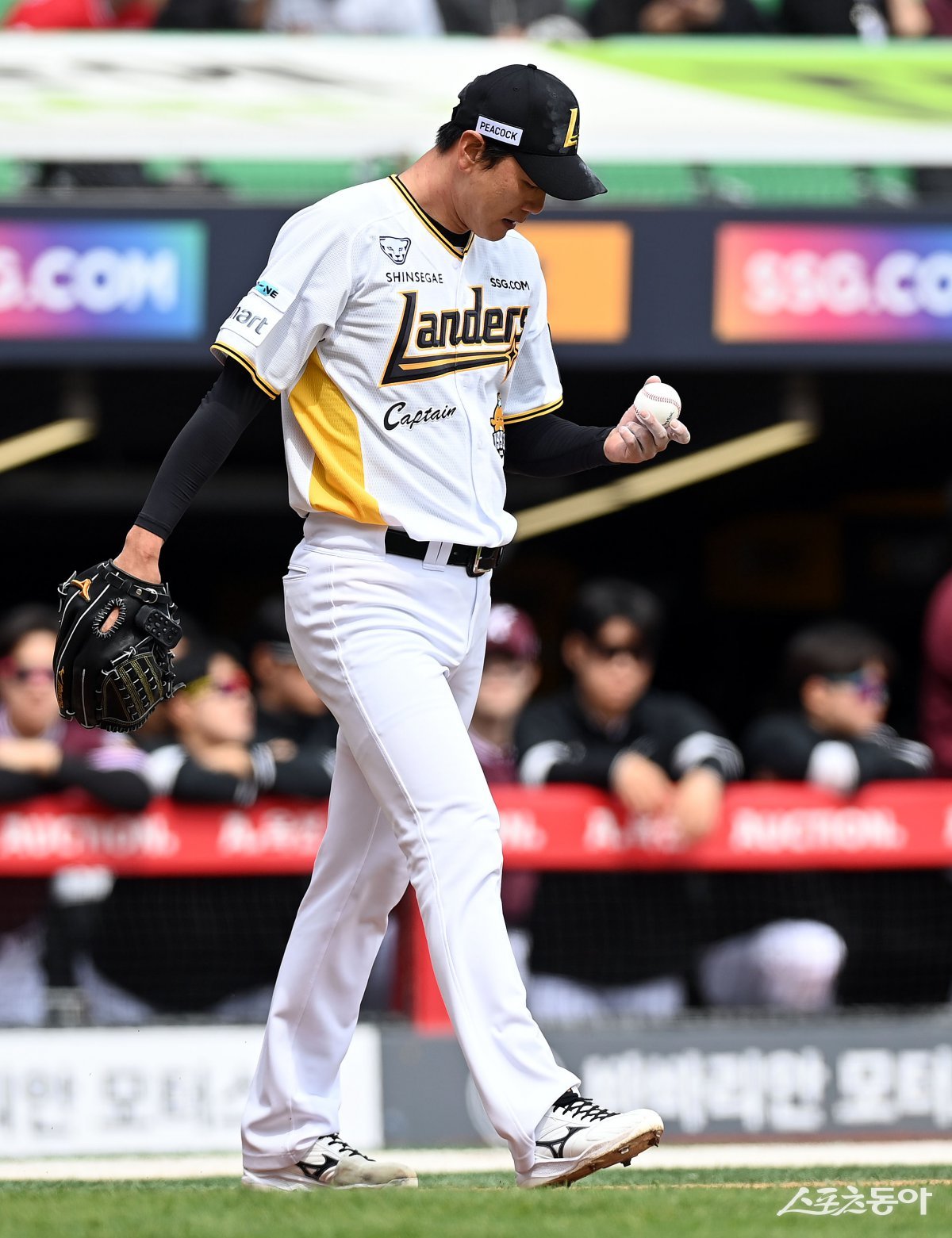 27일 인천 SSG 랜더스필드에서 ‘2025 신한 SOL 뱅크 KBO리그’ SSG 랜더스와 키움 히어로즈의 경기가 열렸다. 3회초 1사 1, 2루에서 김광현이 안타를 허용한 후 아쉬워하고 있다. 인천 | 김민성 기자 marineboy@donga.com