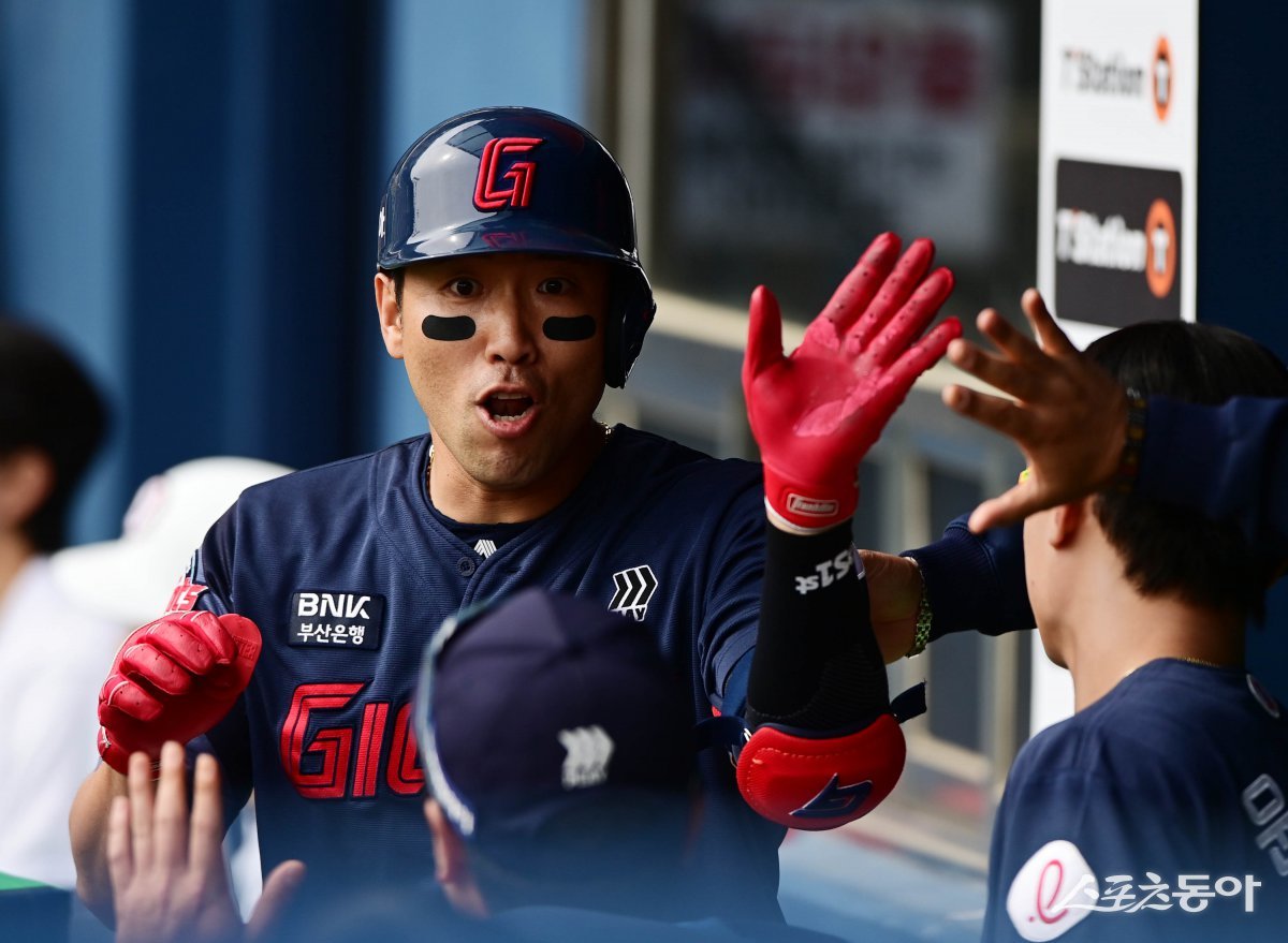27일 서울 잠실야구장에서 열린 ‘2025 신한 SOL Bank KBO리그’ 롯데 자이언츠와 두산 베어스의 경기에서 5회초 1사 롯데 전준우가 좌월 솔로 홈런을 친 후 더그아웃에서 동료들과 기쁨을 나누고 있다. 잠실 | 주현희 기자 teth1147@donga.com