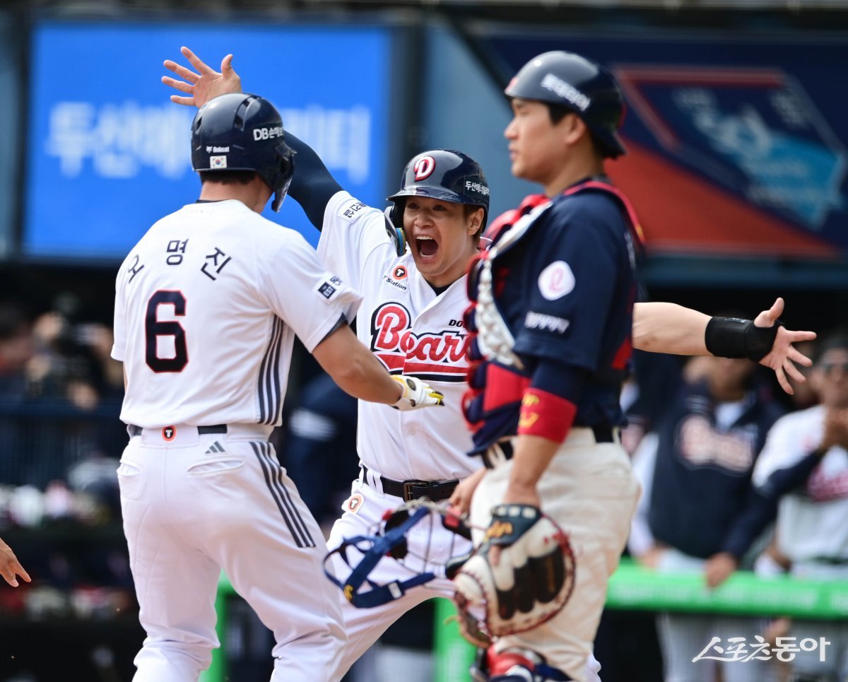 27일 서울 잠실야구장에서 열린 ‘2025 신한 SOL Bank KBO리그’ 롯데 자이언츠와 두산 베어스의 경기에서 4회말 1사 만루 두산 오명진이 우월 만루 홈런을 친 후 김재환과 기븜을 나누고 있다. 잠실 | 주현희 기자 teth1147@donga.com