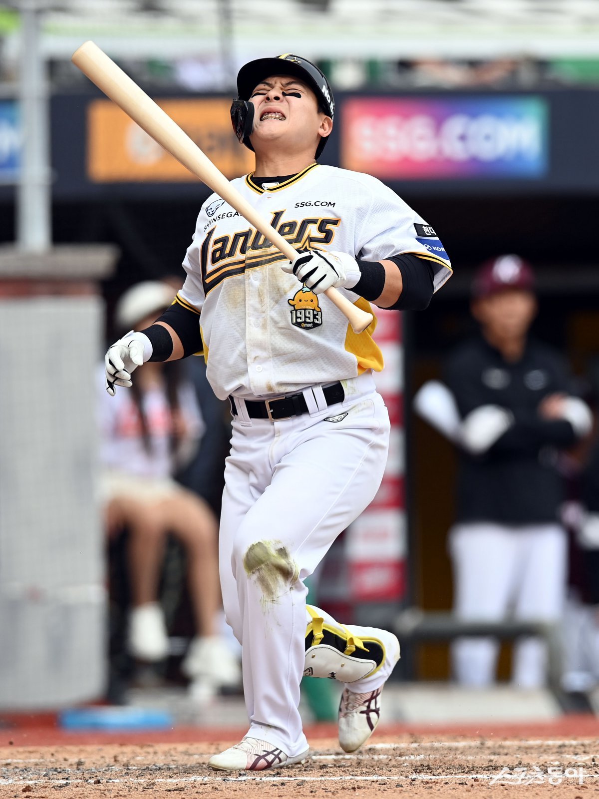 27일 인천 SSG 랜더스필드에서 ‘2025 신한 SOL 뱅크 KBO리그’ SSG 랜더스와 키움 히어로즈의 경기가 열렸다. 7회말 2사 1루에서 SSG 최준우가 투구에 맞은 후 고통을 호소하고 있다. 인천 | 김민성 기자 marineboy@donga.com