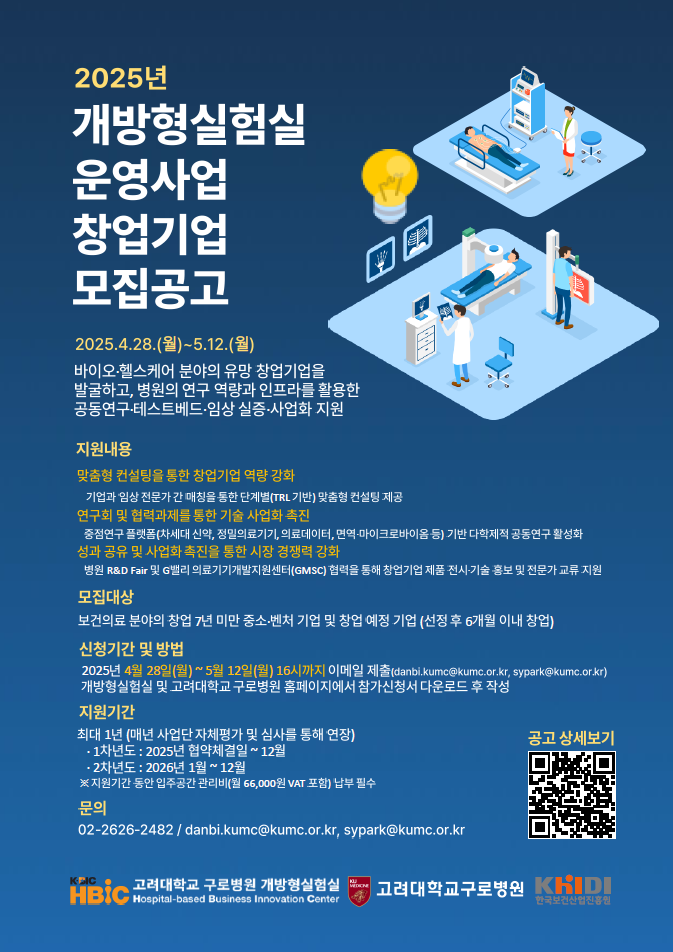 ‘개방형 실험실 운영사업’은 병원과 창업기업 간 공동연구를 활성화하여 보건의료 분야 신기술 및 신제품 개발을 지원하는 보건복지부 사업이다. 고려대구로병원은 2019년, 2022년에 이어 2025년에 세 번째로 지정됐다.