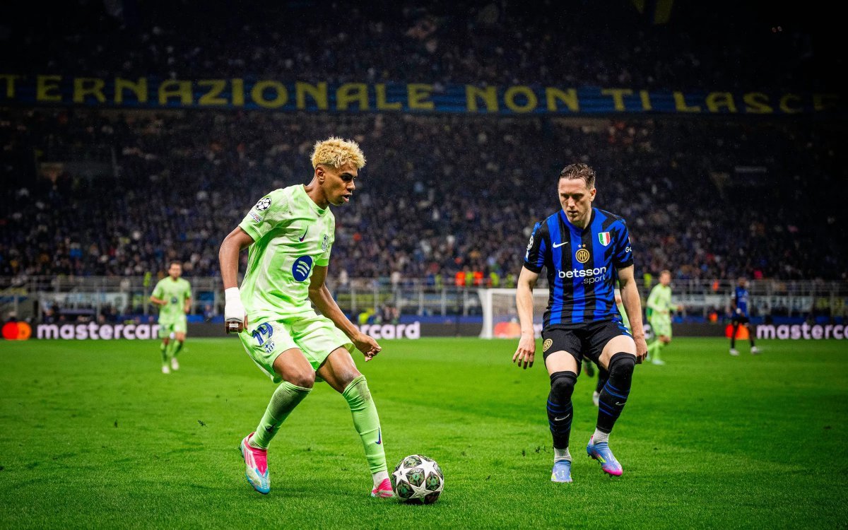 바르셀로나 윙어 라민 야말(왼쪽)이 7일(한국시간) 인터 밀란과 UCL 준결승 2차전 원정경기 도중 드리블을 시도하고 있다. 사진출처|FC바르셀로나 홈페이지