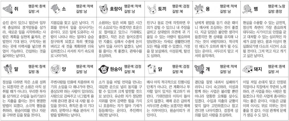 쥐띠 : 승진운이있으니맡은바임무에충실하되경거망동을삼가라.새로운일을시작하려는사람은계획을실천에옮겨라.큰발전이기대된다.구직자는원하는곳에이력서를넣으면취업이가능하다.간섭하는것을싫어하는날이다.