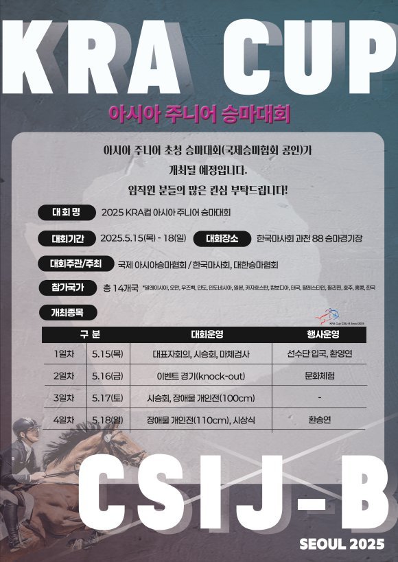 올해로 3회째인 ‘KRA컵 아시아 주니어 승마대회’는 아시아 지역의 유망한 유소년 승마 인재들이 모여 실력을 겨루는 국제 대회다. 총 14개 국에서 28명의 선수가 참가해 장애물 개인전 2종목과 이벤트 1종목을 진행한다. 모든 경기는 국산마를 대상으로 실시한다.