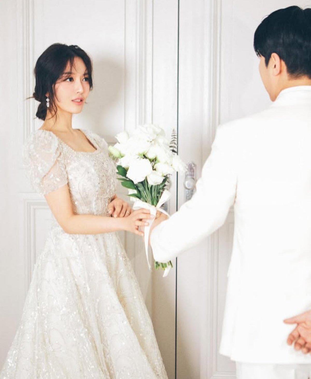 공유한 웨딩 사진 속 도화는 순백의 웨딩드레스를 입고 예비신랑을 바라본다.