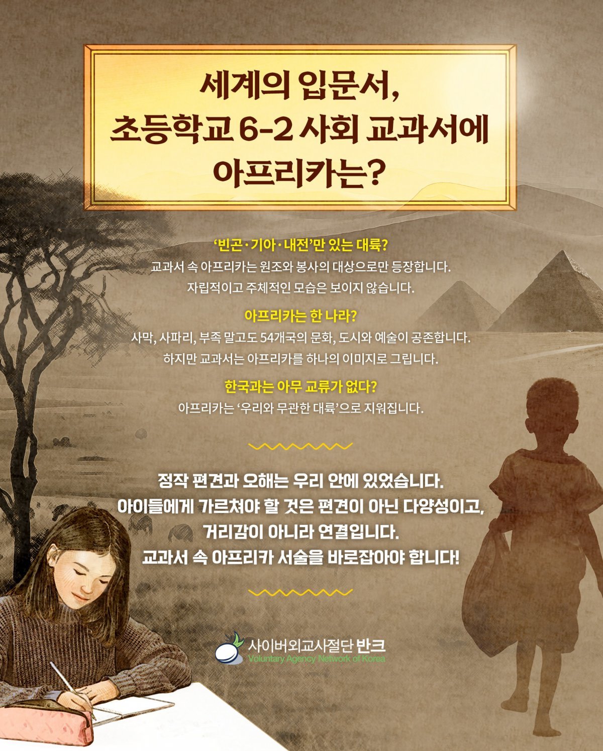 사이버 외교사절단 반크가 국내 초등학교 교과서에 실린 아프리카 관련 서술이 지나치게 편향되어 있다고 지적하며, 교육부에 전면적인 시정과 개선을 촉구했다. 반크는 현행 교과서가 미래 세대에게 왜곡된 세계관을 심어줄 수 있다는 우려를 제기하며, 이를 바로잡기 위한 ‘아프리카 바로 알기 교과서 시정 캠페인’을 전개한다.