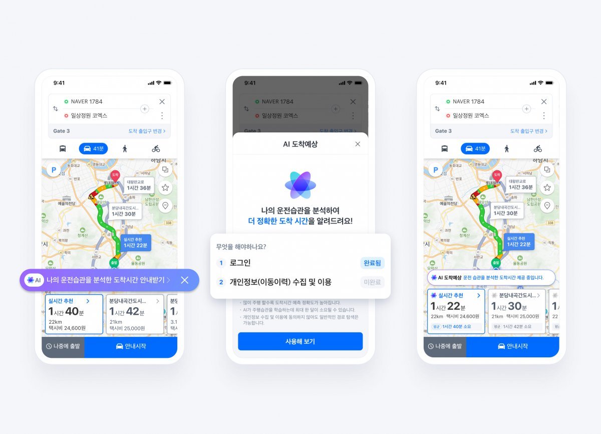 네이버는 ‘네이버 지도’ 내비게이션에 인공지능(AI)을 접목해 이용자 운전 습관을 분석한 뒤 개인 맞춤형 예상 도착 시간을 안내하는 신규 기능을 선보인다. 모든 주행 데이터를 통해 추출한 평균값으로 예측 시간을 도출하는 기존 방식과 달리 사용자 운전 속도, 주행 패턴 등 주행 습관을 기반으로 AI 기반 분석을 통해 이용자 개인에 맞춘 각기 다른 예상 도착 시간을 확인할 수 있다. 로그인과 주행 이력이 있는 이동 이력 관련 개인 정보의 수집·이용에 동의한 이용자는 별도 설정 없이 누구나 활용 가능하다. 여러 번의 주행을 통해 AI가 사용자 주행 스타일을 학습하면 점점 더 정밀한 결과를 제공받을 수 있다. 이용자 안내 화면에는 개인 맞춤형 도착 시간 안내는 물론, 모든 이용자의 데이터 기반으로 예측된 일반적인 평균 도착 소요 시간도 함께 제공해 보다 정확한 시간 가늠이 가능해진다. 이은실 네이버 지도 리더는 “이번 AI 기반의 개인화된 예상 도착 시간 제공을 시작으로 향후에도 AI 접목을 확대한 특화 내비게이션 기능을 두루 선보이며 이용자 편의를 향상시킬 것이다”고 말했다.