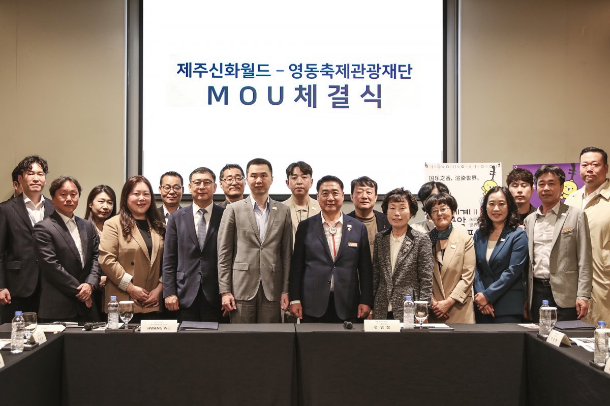 복합리조트 제주신화월드는 충북 영동군과 관광과 문화 콘텐츠를 공동 마케팅하는 업무협약을 맺었다.