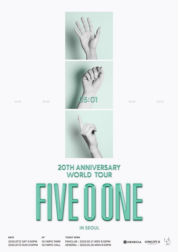 13일 오전 헤네치아는 “FIVE O ONE이 오는 7월 12일과 13일 양일간 서울 올림픽공원 올림픽홀에서 ‘2025 FIVE O ONE : 20th Anniversary World Tour In Seoul’을 개최한다. 월드 투어의 첫 시작이 될 이번 공연에서 오랜 시간을 기다린 팬들에게 보내는 세 사람의 아름다운 하모니가 감동을 선사할 예정이다”고 알렸다.