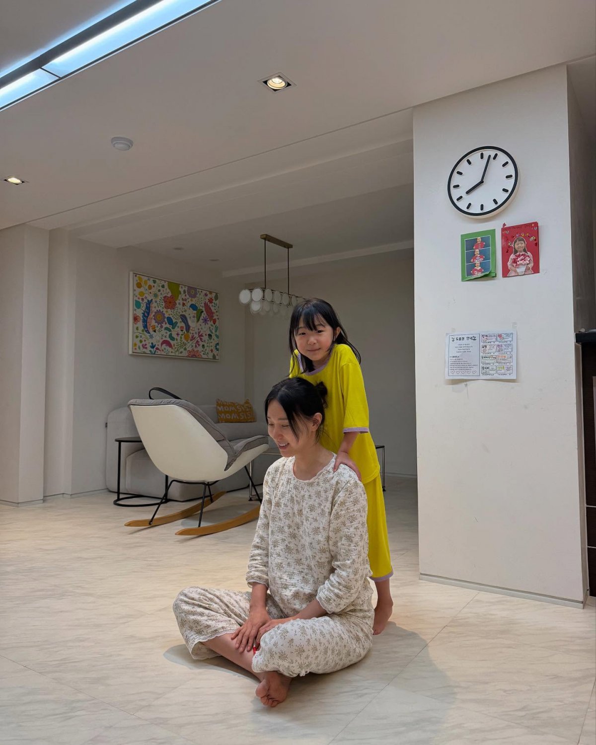공개된 사진에는 태리가 작은 손으로 엄마의 어깨를 꾹꾹 눌러주는 모습, 바닥에 엎드린 엄마의 등을 마사지하는 장면, 그리고 아빠의 피로까지 풀어주는 사랑스러운 효도의 순간이 고스란히 담겼다.