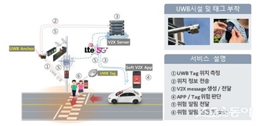 실시간 경고 시스템의 작동 방식은 학생 가방이나 옷에 부착된 UWB 태그는 인근 차량과의 거리 정보를 실시간 수집하고 수집된 정보는 AI 기반 CCTV 및 초광대역 수신 인프라와 연동해 위험 상황이 감지되면 보행자뿐 아니라 차량, 자전거, 전동킥보드 운전자에게도 스마트폰 경고 메시지를 전송한다.