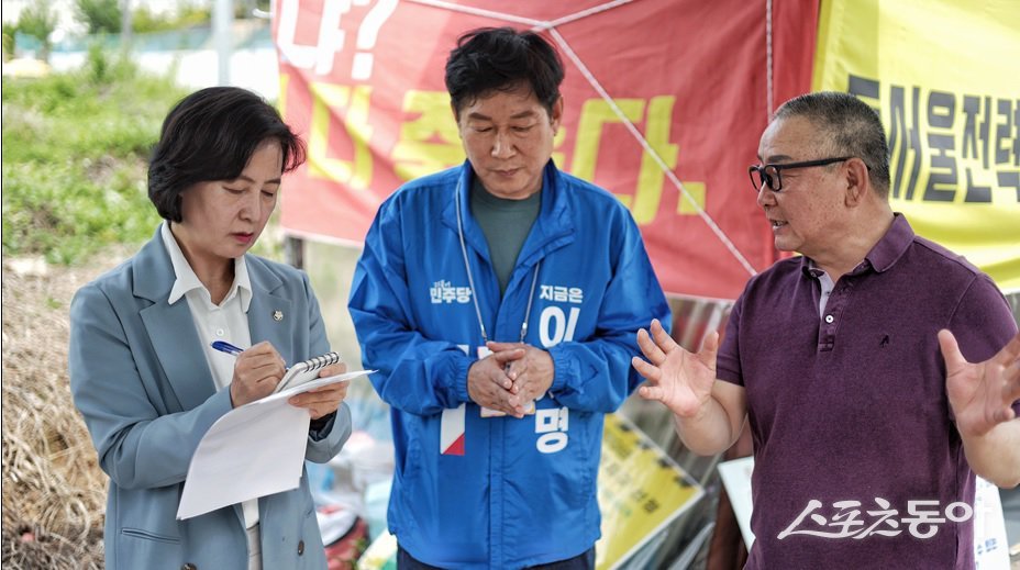 지난 13일 추미애 위원장이 감일동 동서울전력소 증설 반대 비상대책위원회 천막 농성장을 찾아 경청 투어를 진행하고 있다. 사진제공|하남시(갑)선거대책위원회