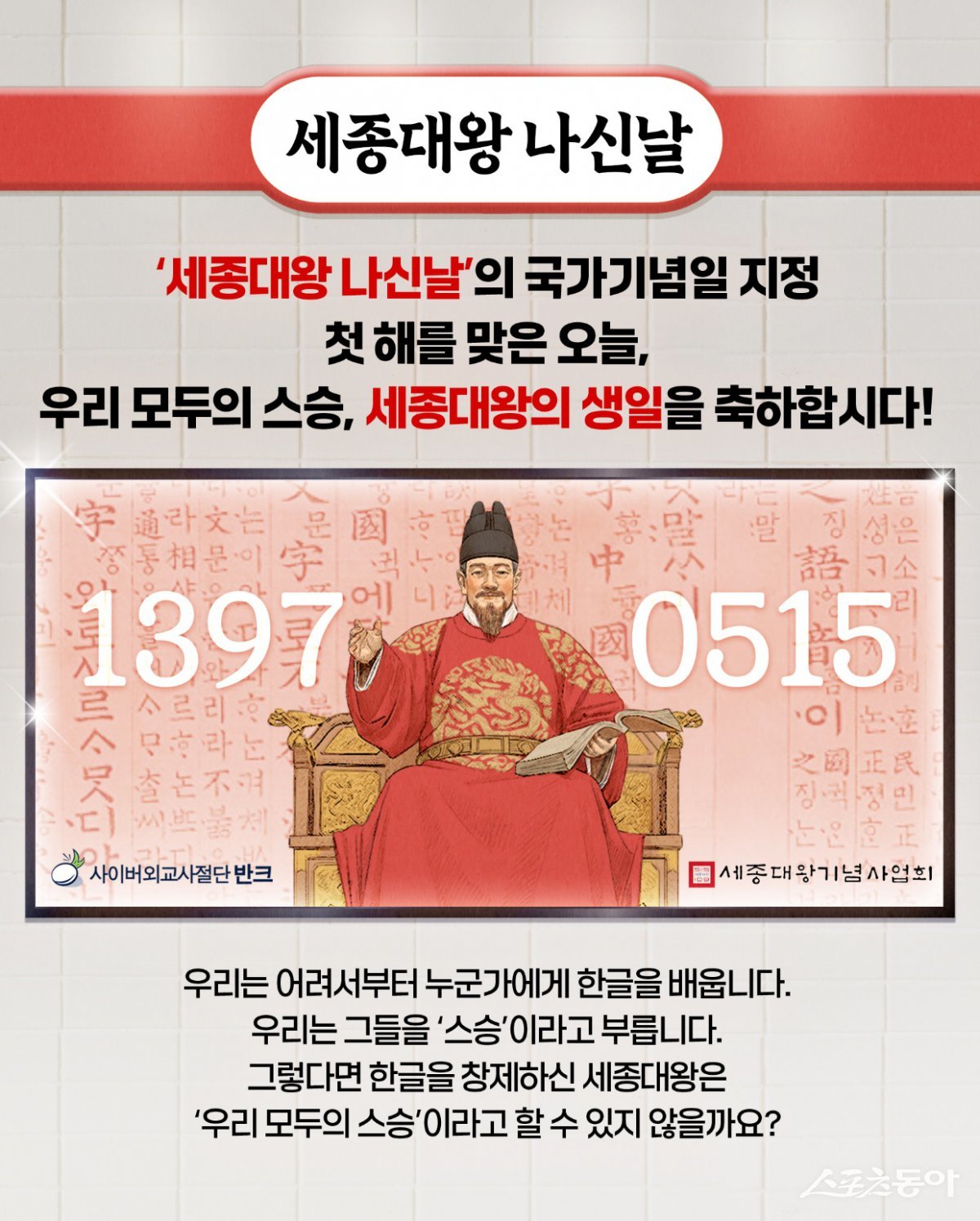 사이버외교사절단 반크와 세종대왕기념사업회는 ‘세종대왕 나신 날’이 국가기념일로 공식 지정된 첫해를 맞아, 세종대왕을 단순한 국왕을 넘어 ‘우리 모두의 스승’으로 재조명하는 캠페인을 추진한다.