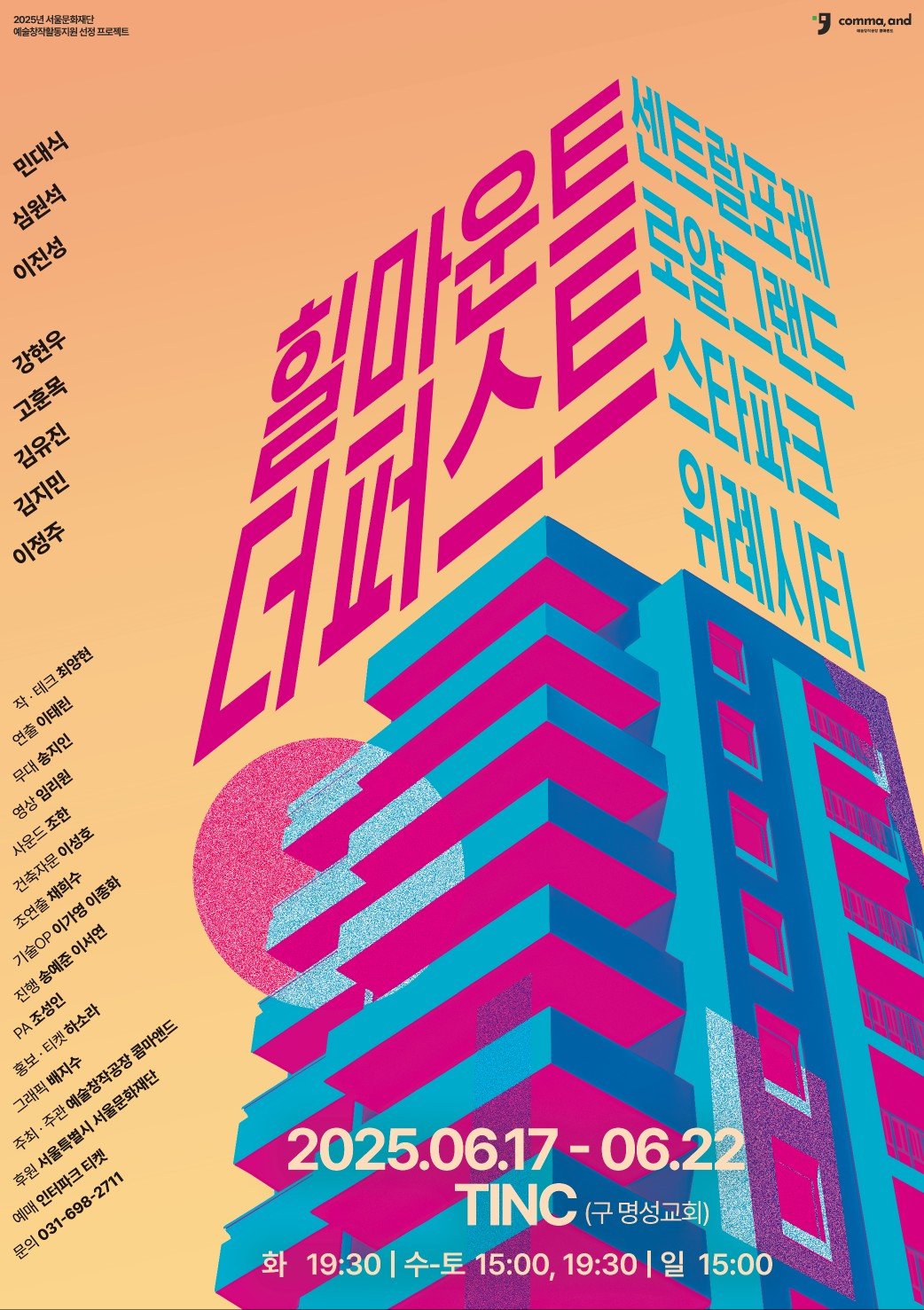 이보다 더 긴 아파트 이름, 본 적 있으신지. 이 황당하면서도 현실적인 이름을 내건 이머시브 연극 ‘힐마운트 더퍼스트 센트럴포레 로얄그랜드 스타파크 위례시티(이하 힐마운트)‘가 6월 17일부터 22일까지 서울 대학로 TINC(구 명성교회)에서 관객들을 만난다.