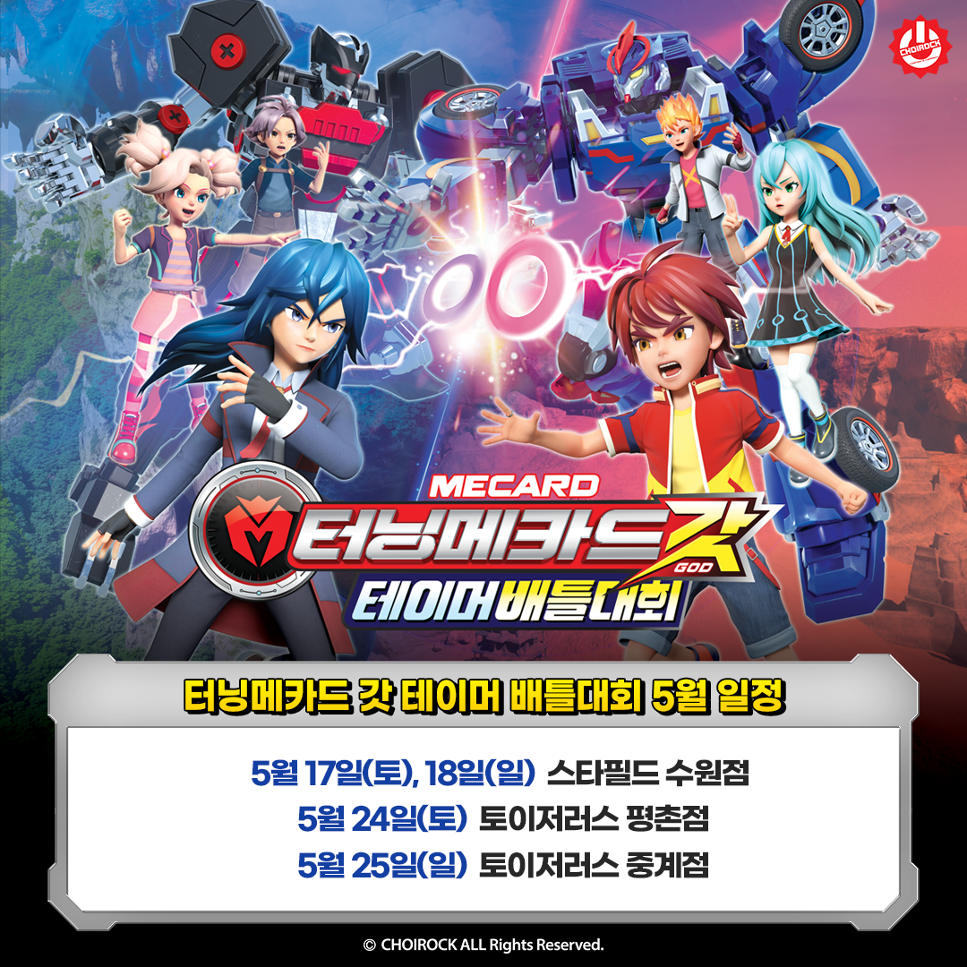 초이락컨텐츠컴퍼니가 11월까지 주말마다 스타필드, 이마트, 토이저러스 등과 최신 IP ‘터닝메카드 갓 테이머 배틀대회’(사진)를 연다.
