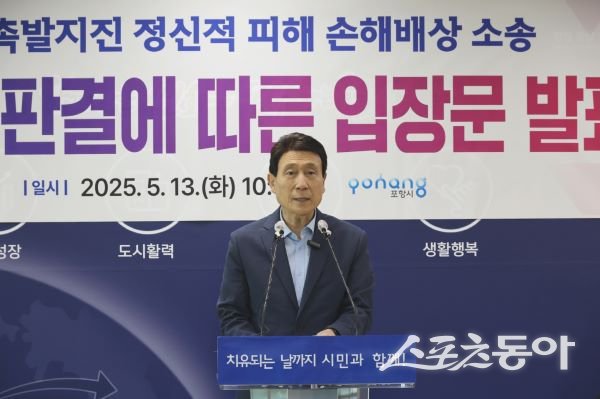 이강덕 포항시장이 지난 13일 시청 브리핑룸에서 포항 촉발지진 정신적 피해 손해배상 항소심 판결 직후 입장문을 발표하고 있는 모습. 사진제공|포항시