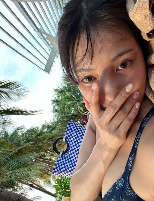 햇살 아래 선베드에 누워, 한 손엔 칵테일을 든 채 카메라를 바라보는 그의 셀카는 ‘인간 여름’ 그 자체. 짙은 네이비 패턴의 비키니 톱과 청록 하이웨이스트 팬티는 감각적인 믹스매치 스타일링을 완성했고, 선글라스 없이도 눈부신 얼굴이 더 눈부셨다. 민트 잎이 올라간 칵테일까지 한껏 여름 맛.
