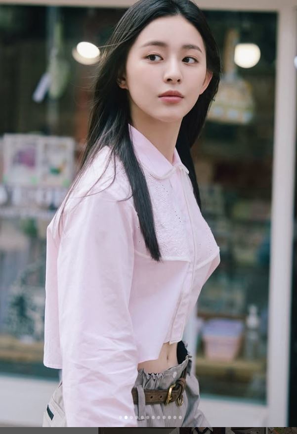 박지후가 선택한 스타일은 러블리한 베이비핑크 크롭 셔츠와 하이웨이스트 그레이 버뮤다 팬츠의 조합.