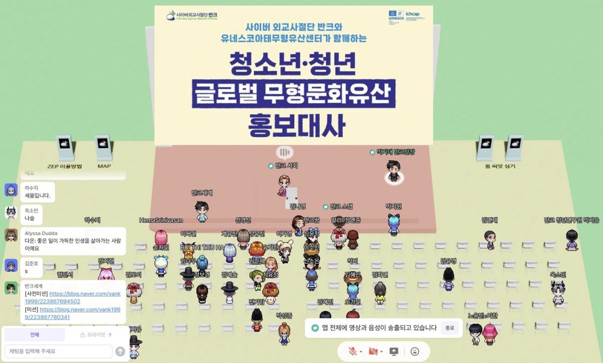 사이버외교사절단 반크는 유네스코아태무형유산센터와 협력하여, 청소년·청년을 대상으로 아시아태평양 지역의 무형문화유산에 대한 인식을 제고하고, 세계 시민으로서의 책임감을 갖춘 ‘글로벌 무형문화유산 홍보대사’를 양성한다. 반크는 83명의 청소년·청년을 선발하여 ‘글로벌 무형문화유산 홍보대사’로 선발하고, 19일 메타버스에서 발대식을 개최하며 공식 활동의 시작을 알렸다.