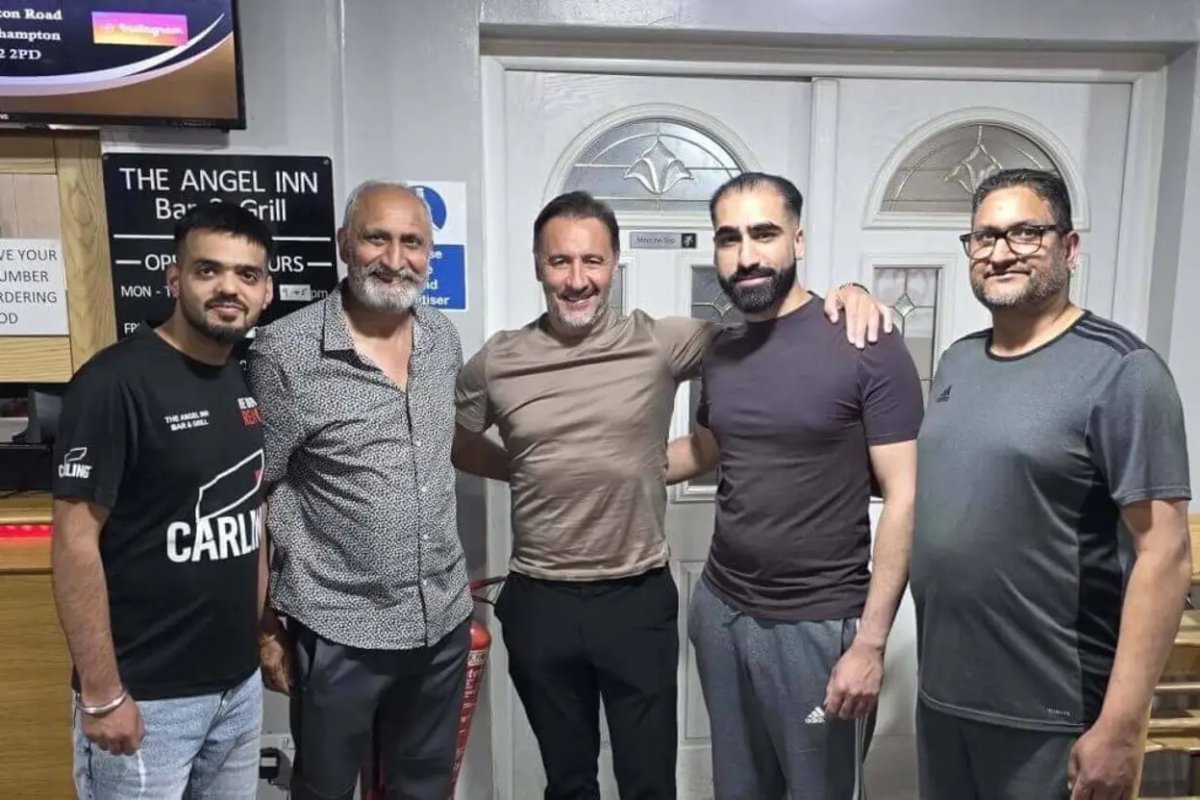 울버햄턴 비토르 페레이라 감독(가운데)이 울버햄턴 근교의 한 맥주펍에서 손님들과 함께 포즈를 취하고 있다. 사진출처|페이스북
