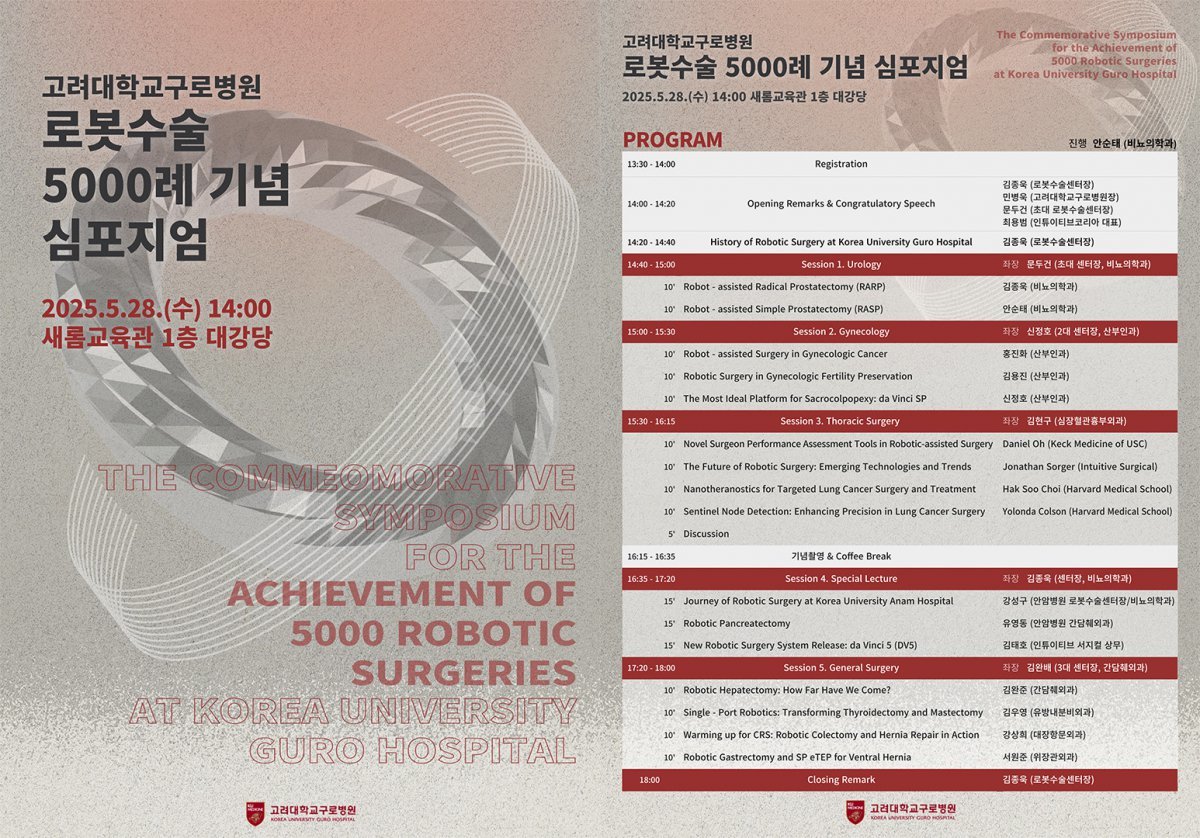 민병욱 고려대구로병원장은 “이번 심포지엄은 그동안의 발자취를 돌아보고, 진료과별 로봇수술의 현재와 미래를 조망할 수 있는 의미 있는 자리가 될 것”이라며 “앞으로도 고려대 구로병원은 환자 중심의 정밀의료를 실현하며 국내 로봇수술을 선도해 나가겠다”고 말했다.