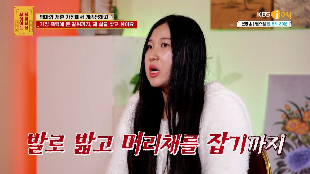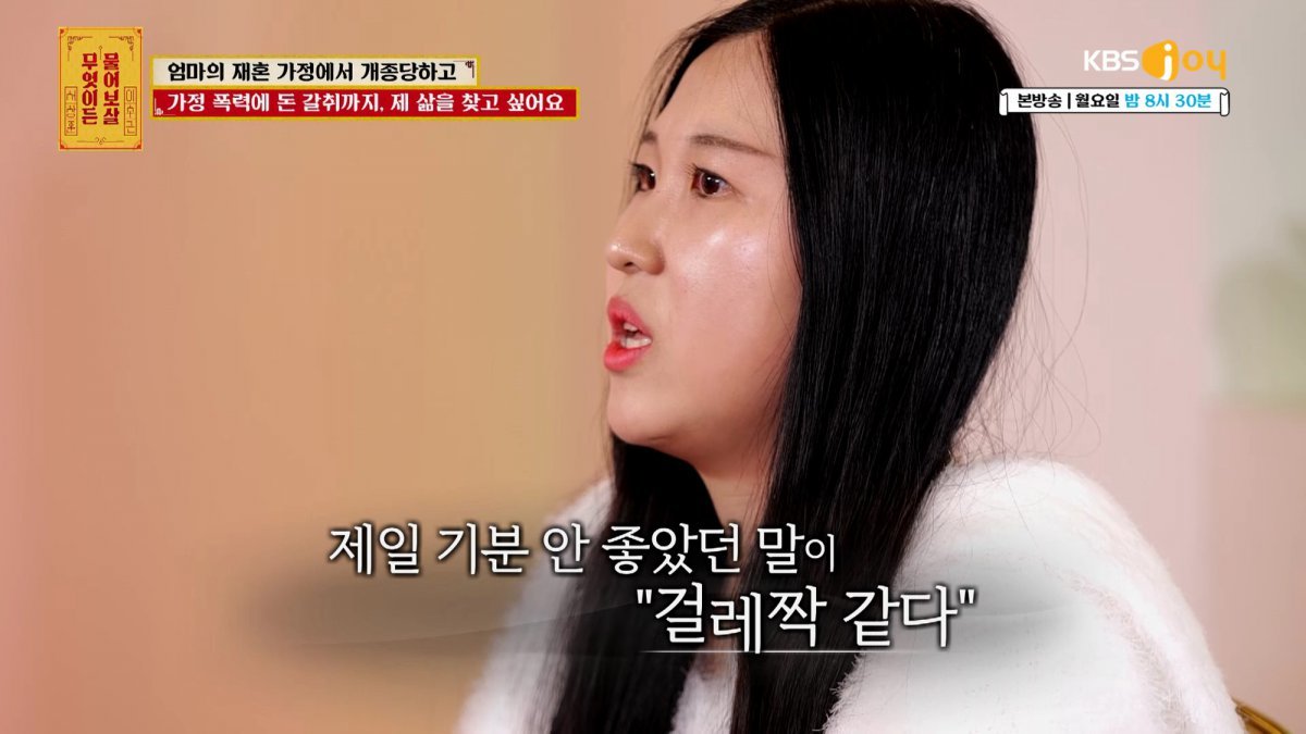 사연자는 “새아버지가 일이 점차 줄면서 폭력적인 모습이 나타나기 시작했다”면서 “말대답한다며 형제 중 유독 나에게만 그랬다”고 말한다. “의붓아버지가 했던 폭언 중 가장 기분 안 좋았던 말이 ‘걸레짝 같다’는 말이었다. 찢어진 바지를 나에게 입히더니 ‘잘 어울린다. 이걸로 청소해도 되겠다. 너 걸레다’라고 하더라”라고 덧붙였다. 이에 서장훈과 이수근은 극히 분노하는 모습을 보였다.