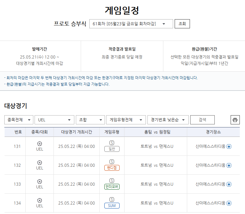 UEL 결승 토트넘-맨체스터 유나이티드전, 프로토 승부식 61회차 대상경기 선정