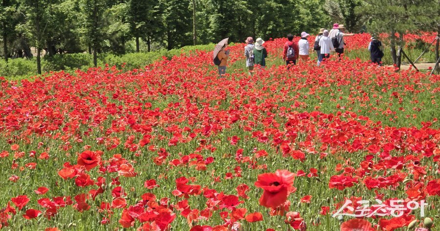 붕어섬 생태공원과 요산공원 일대 1만2000㎡ 규모의 꽃양귀비밭은 바람에 흔들리며 붉은 물결이 출렁이는 듯한 풍경을 연출, 태양 아래 더욱 선명하고 강렬한 색감을 뽐내며 방문객들의 탄성을 자아내고 있다.