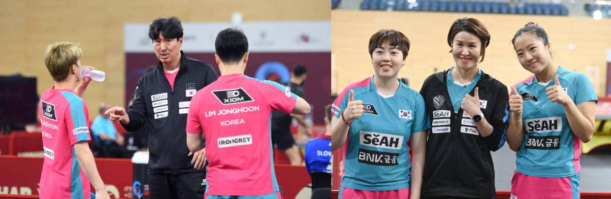 한국탁구는 오상은(왼쪽 사진 가운데)-석은미(오른쪽 사진 가운데) 감독 체제에서 세대교체에 접어들었다. 지난해 8월 2024파리올림픽 이후 변화의 시기에 접어든 가운데, 두 감독은 기대와 고민을 안고 카타르 도하 세계탁구선수권대회를 치르고 있다. 사진제공│대한탁구협회