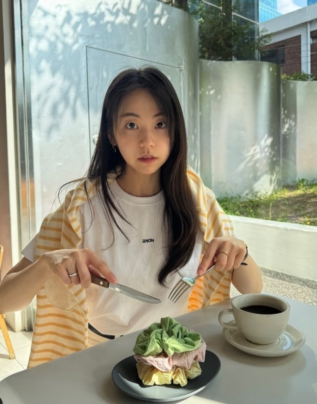 사진 속 케이크도 마치 룩의 일부처럼 보인다.화이트 테이블 위에 놓인 무지갯빛 크레이프 케이크, 거기에 따뜻한 블랙 커피. 안소희의 패션과 톤온톤처럼 어울린다. 전반적으로 파스텔과 내추럴이 뒤섞인 색 조합은 요즘 유행하는 ‘무드 있는 일상샷’ 그 자체.