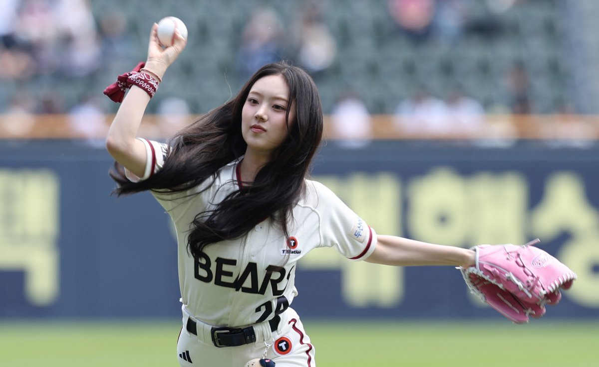 25일 오후 서울 송파구 잠실야구장에서 열린 2025 KBO리그 NC 다이노스와 두산 베어스의 경기에 앞서 걸그룹 키키(KiiiKiii) 이솔이 시구를 하고 있다. 뉴시스
