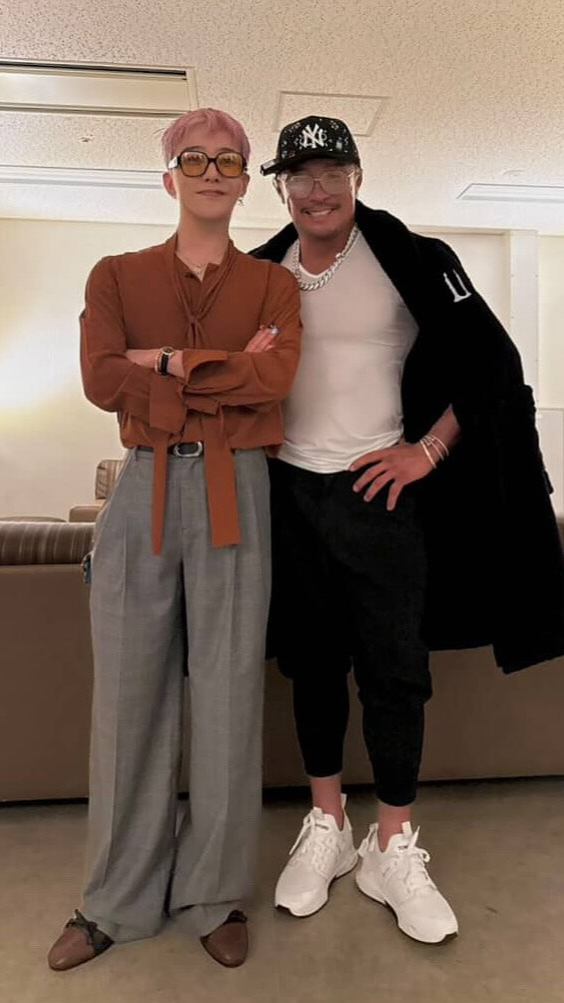 사진 속 두 사람은 일본 콘서트 대기실에서 환하게 웃으며 포즈를 취하고 있다. 지드래곤은 선글라스를 착용한 여유로운 모습, 추성훈은 화려한 패션으로 시선을 사로잡았다.