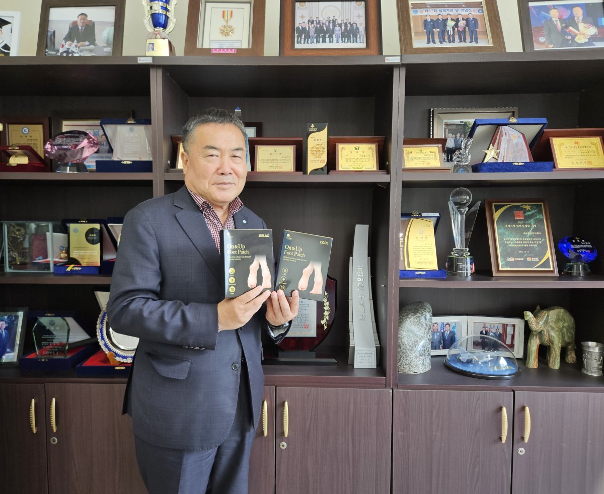 KJI공업 홍기진 대표이사가 천연성분인 살리실산메틸이 함유된 신제품 ‘온업풋패치’를 들고 포즈를 취하고 있다. 홍 대표는 “‘온업풋패치’는 발의 피로와 근육 통증, 부종 완화에 효과가 있다”고 설명했다. 사진제공 ㅣ KJI공업