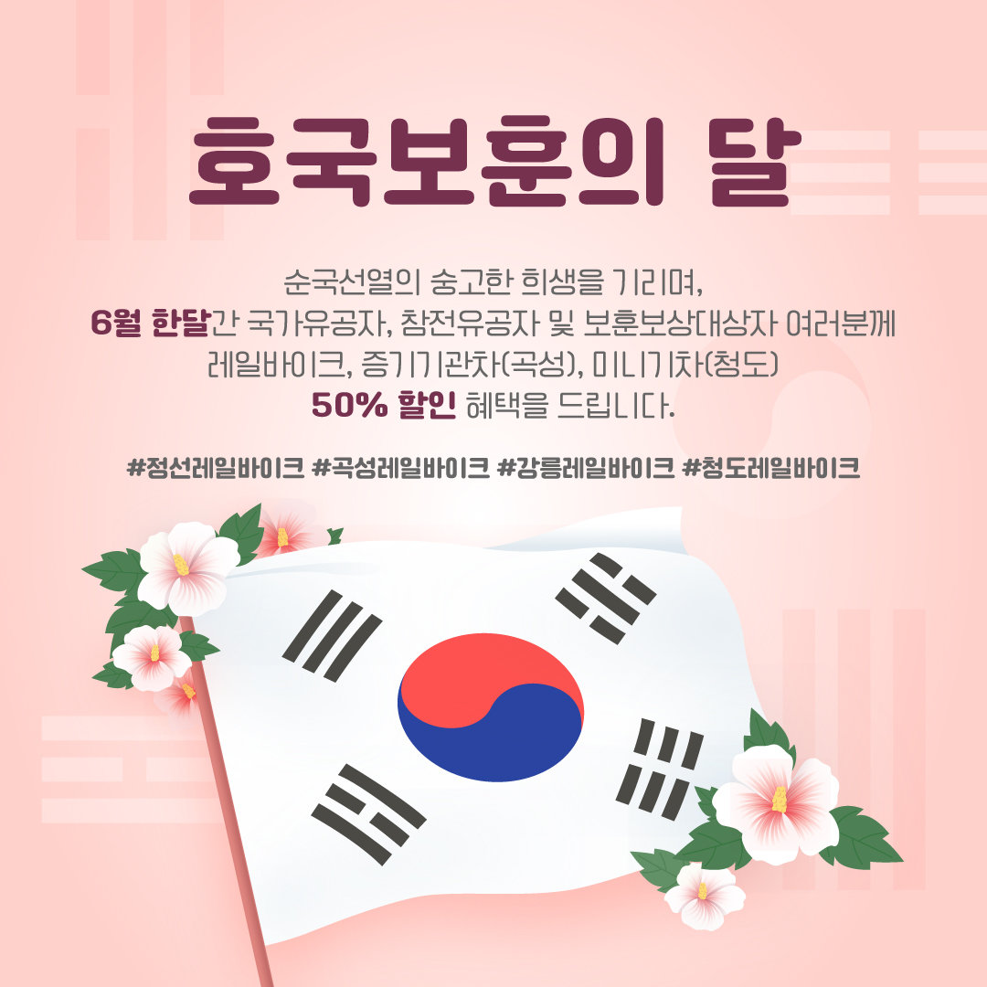 코레일관광개발(대표이사 권백신)은 6월 호국보훈의 달을 맞아 보훈 국민(국가유공자, 참전유공자, 보훈보상대상자)에게 전국 주요 레일바이크 사업장에서 50% 할인을 제공한다.