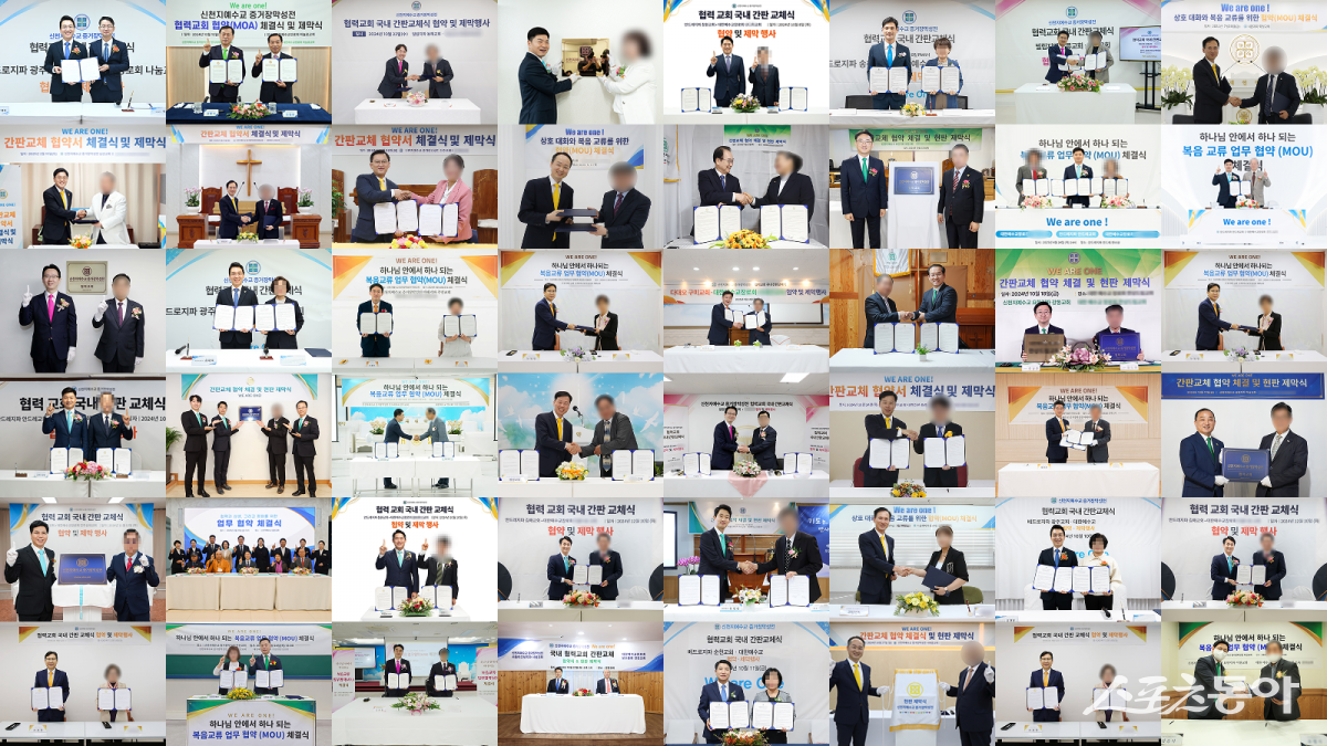 국내 기성교단 소속 교회 중 100곳 이상이 신천지예수교회의 간판을 내걸고 말씀을 전하고 있는 것으로 알려진 가운데 기성교단 관계자들이 신천지와 간판교체 및 말씀교류 MOU를 맺고 기념촬영을 하고 있다. (사진제공=신천지예수교회)