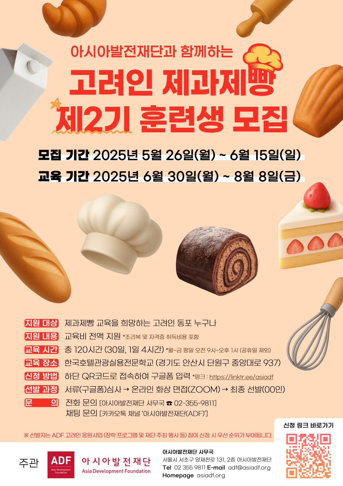아시아발전재단 6월 15일까지 ‘고려인 동포 직업훈련 지원사업’의 일환으로 제과제빵 직업훈련 2기 교육생을 모집한다고 밝혔다. 이 교육은 만 16세 이상 국내 거주 고려인 동포라면 누구나 지원할 수 있으며, 교육비는 물론 자격증 응시 비용까지 전액 지원된다.