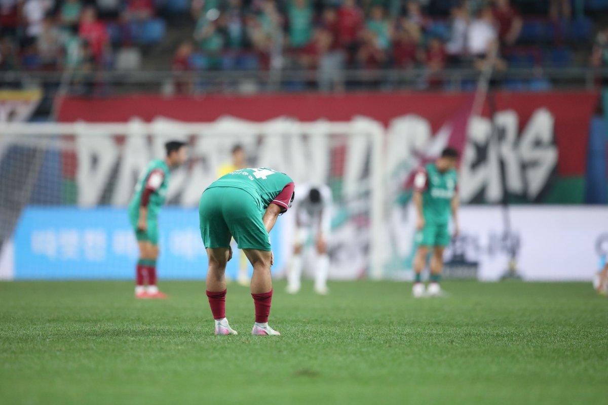 대전하나 선수들이 27일 대전월드컵경기장에서 열린 포항과 K리그1 16라운드 홈경기에서 1-3으로 패한 뒤 허리를 굽히며 허탈해하고 있다. 수비 불안이 아킬레스건으로 작용하는 모습이다. 사진제공|한국프로축구연맹