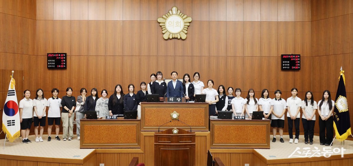 김연균 의장은 학생들을 맞이해 환영 인사를 전하며, “오늘의 경험이 미래의 꿈을 그려보는 계기가 되길 바란다”며 “시민의 목소리에 귀 기울이는 시의회를 직접 보고 느낄 수 있는 소중한 시간이 되기를 바란다”고 말했다.