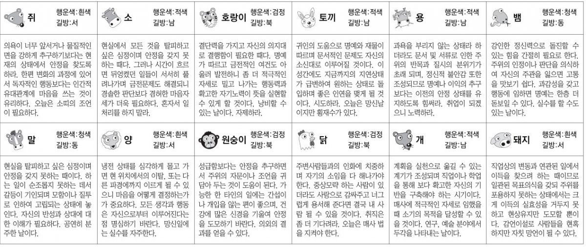 뱀띠 : 강인한정신력으로돌진할수있는힘을간절히필요로한다.주위의인정이나판단을의식하여자신의주관을잃으면고통을맛보기쉽다.과감성을갖고행동에임하면명예는한층더돋보일수있다.실수를할수도있는날이다.